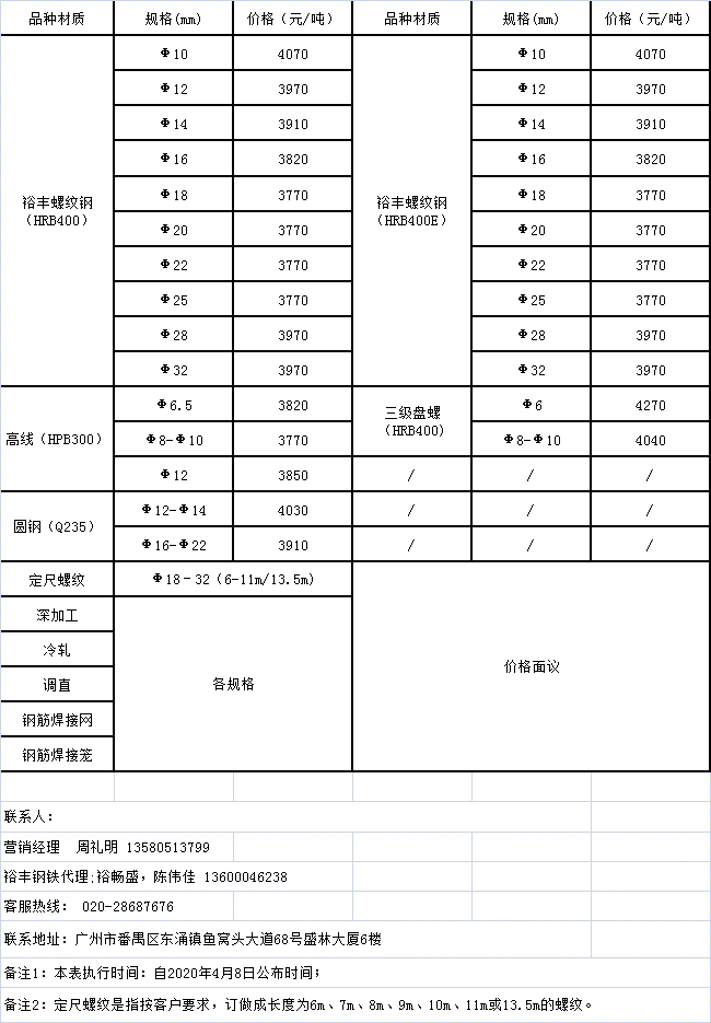4月8日廣州市番禺裕豐鋼鐵有限公司價格表